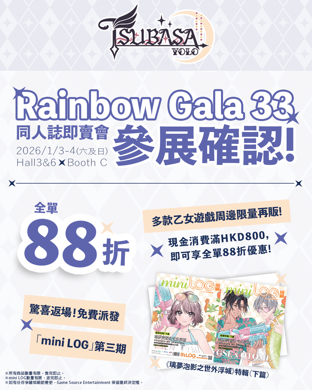 為確保每天入場人士都有機會領取,「mini LOG」派發將於指定時段進行,數量有限,派完即止。詳細派發時間表請關注 Tsubasa~YOLO~(@tsubasa_yolo)及 GSE乙女遊戲部Instagram(@gse_otome)稍後公布的資訊。